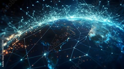 Global Connection: A vivid illustration of the interconnected world, showcasing a network of digital connections overlaid on a globe, representing data flow and worldwide communication.