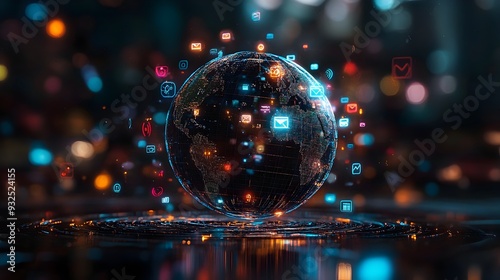 Global Digital Connectivity Visualized with Search Engine Symbols Orbiting 3D Sphere