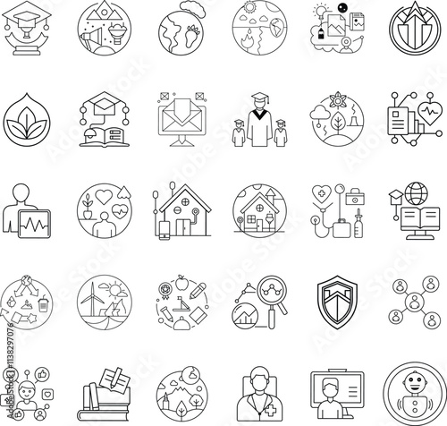Global Education, Sustainability, and Technology Icons World, Graduate, Green, Innovation