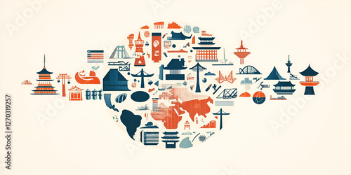 Global Heritage Mosaic: A visually engaging illustration showcases a vibrant mosaic of iconic landmarks and cultural symbols, artfully arranged to form the shape of the earth.
