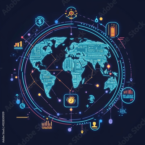 Global inflation analysis, neon digital network, economy system, financial programs, flat design illustration