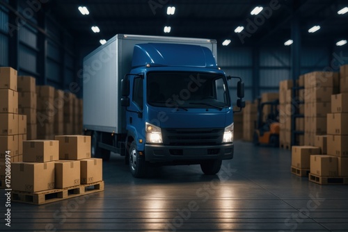 Global inventory system. A blue delivery truck in a warehouse surrounded by stacked cardboard boxes.