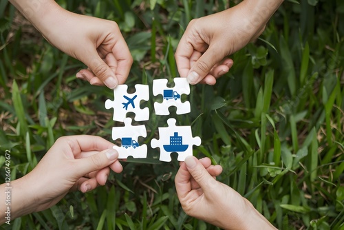 Global Logistics Puzzle Teamwork Hands Green Grass Background International Transportation Supply Chain Management Business Concept Efficient Delivery Worldwide Shipping Air Freight Truck Cargo Boat