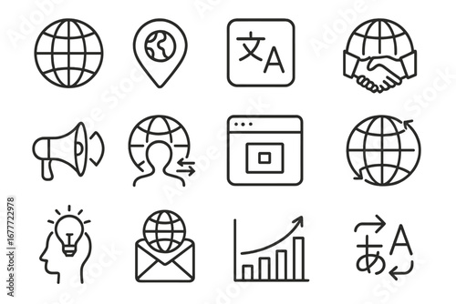 Global Marketing Icons. Line style icons of global marketing: globe icon, localization badge, multi-language icon, international