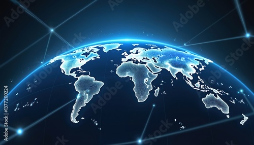 Global network connection concept on world map background. Digital earth, interconnected lines represent worldwide connection, communication. Modern tech cyberspace illustration, for business, social