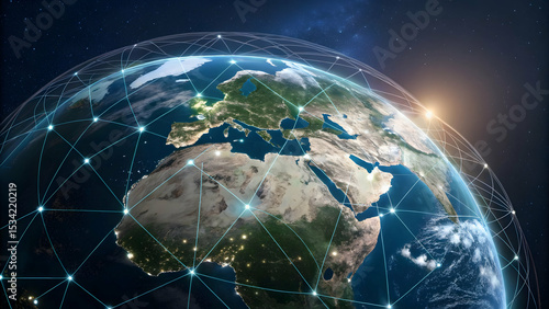 Global Network Connection Over Earth with Satellite View at Dusk
