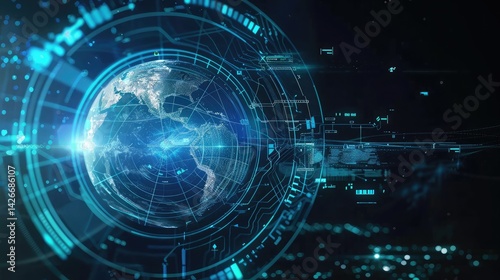 Global network map with high-tech digital interface ,A vibrant digital map of the Earth glows with interconnected network points, illustrating global connections and data flow