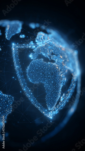 Global network protection concept, showing secure digital connections, firewalls, and shields protecting data across continents in hyperrealistic visualization.