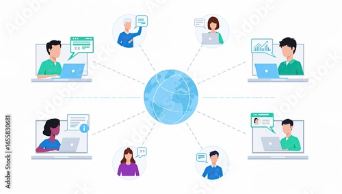 Global Online Communication Network Depicted with Diverse People and Laptops
