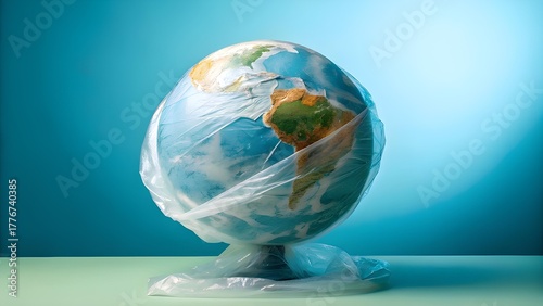 Global pollution crisis visualized with planet Earth encased in transparent plastic, highlighting environmental concerns and the urgent need for change.