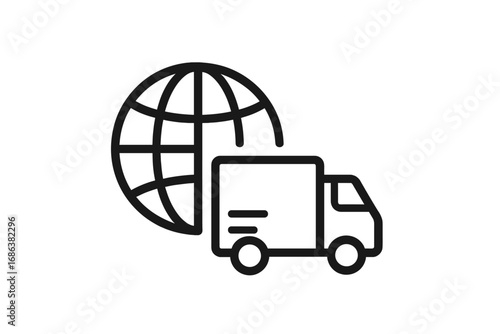 Global shipping logistics vector icon. Delivery truck and planet earth minimal line art for web, app, banner. International freight, worldwide transport service, export import concept illustration.