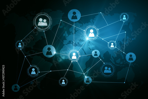Global social network concept with digital graphic user symbols connected by lines on blue world map background. 3D rendering