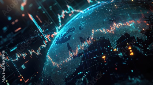 Global stock market connection, charts intertwining around Earth, 3D illustration