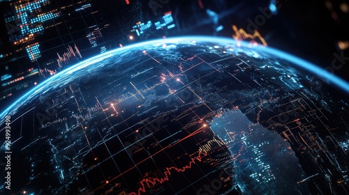 Global stock market connection, charts intertwining around Earth, 3D illustration