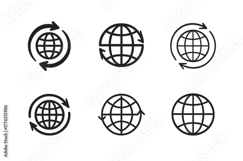 Global Trade Logos. Global cooperation. Set Logo of Global cooperation: global trade arrows encircling sphere. Icon set. harmonious logo variations of the same