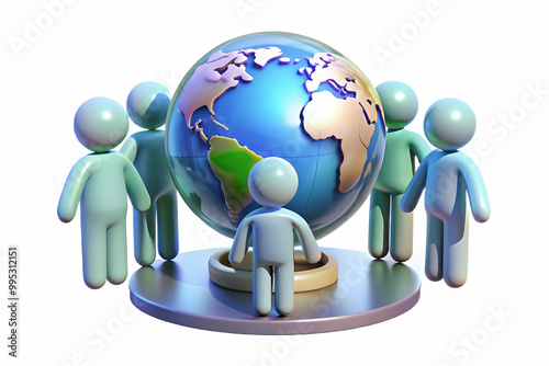 Global Unity Concept: Flat Glossy Holographic Human Figures Holding Hands Around a Glowing Globe in White Space - Smart Business Vector Illustration with Copy Space