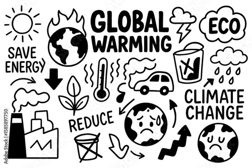 Global warming and climate change icons in expressive hand-drawn style, Transparent Background