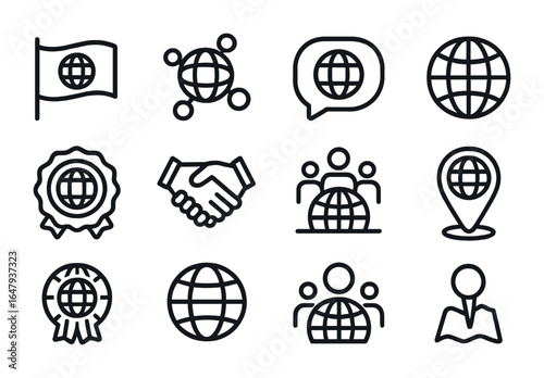 Global Youth Icons. Outline icon set of global youth movements: world flag, international network, language