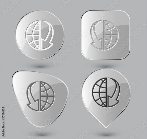 Globe and array down. Glass buttons. Vector illustration.