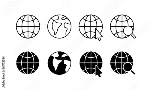 Globe and earth planet web icons in line style. Navigational Equipment, Planet Earth, Airplane, Map. Vector illustration.
