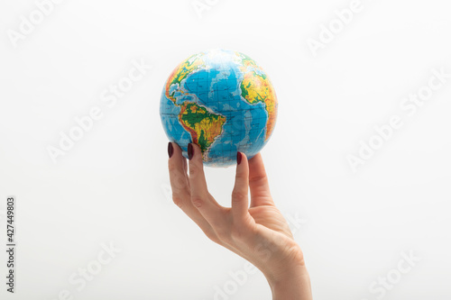 Globe at the tip of woman's fingers. Female hand holds globe. World in human hands. White background