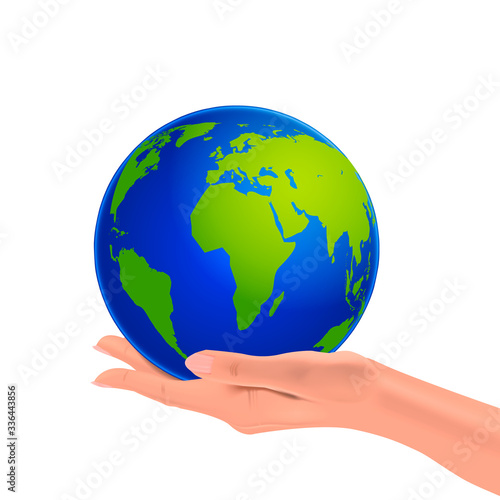 Globe of the planet Earth in a woman's hand, realistic hand holding the planet, nature protection concept, vector illustration