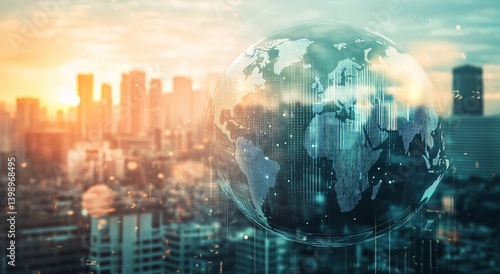 Globe overlay on cityscape with blurred buildings and sunset sky background.