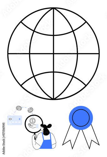 Globe representing global finance, magnifying glass inspecting dollar signs, reward ribbon emphasizing achievement, and money transaction process. Ideal for business, economy, banking, success