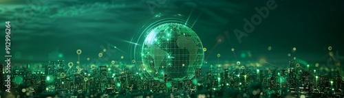 Globe with ecofriendly transport and green technology symbols minimalistic flat blue background art space for text