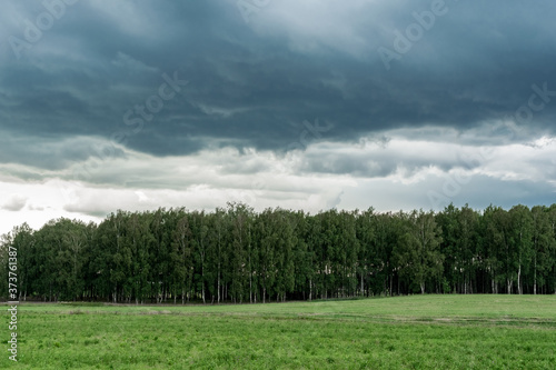 Gloomy birch grove in a storm. Dark rainy clouds of an impending cyclone