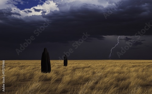 Gloomy picture of a woman in a black raincoat hooded as a symbol of death approaching a young girl on a cliff edge