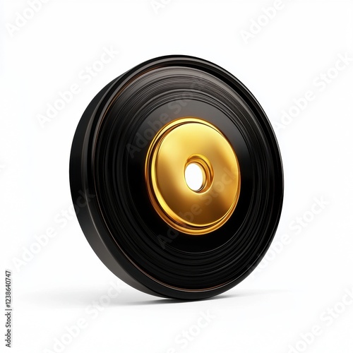 Glossy black vinyl record with a golden label isolated on white background