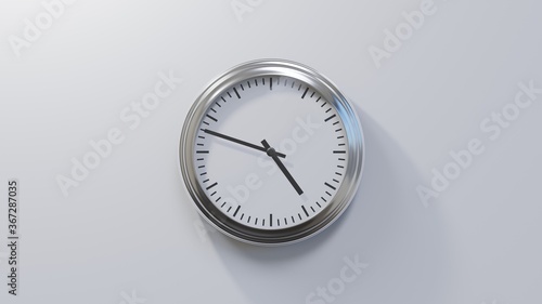 Glossy chrome clock on a white wall at forty-eight past four. Time is 04:48 or 16:48
