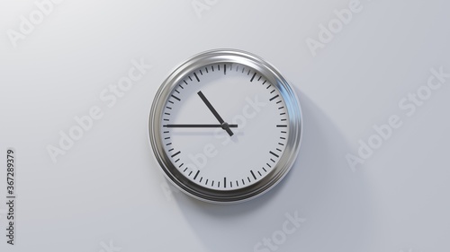 Glossy chrome clock on a white wall at quarter to eleven. Time is 10:45 or 22:45