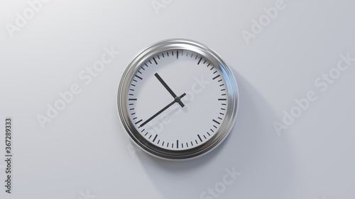 Glossy chrome clock on a white wall at thirty-nine past ten. Time is 10:39 or 22:39