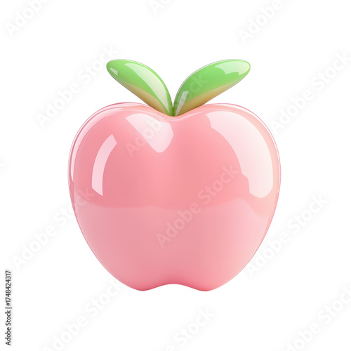 Glossy Pink Apple with Green Leaves on White Background 3D Render