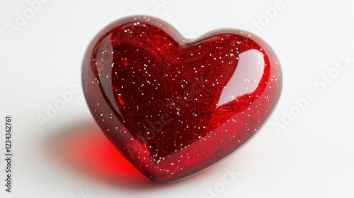 Glossy Red Heart Shape Decoration with Sparkles on White Surface