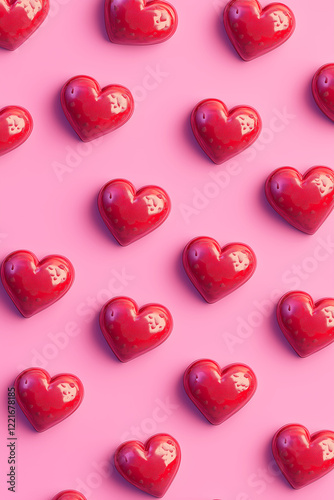 Glossy red heart-shaped chocolates neatly arranged in a seamless pattern on a pastel pink background for a romantic Valentine's Day aesthetic