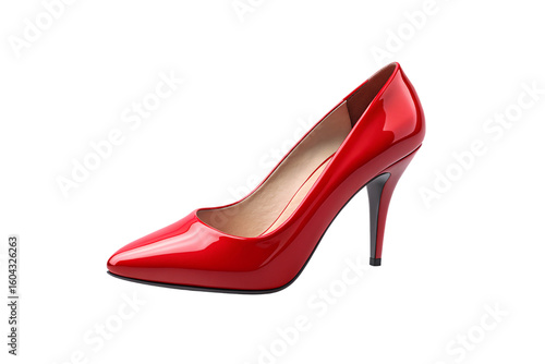 Glossy red patent leather high heel pump shoe with pointed toe, isolated on a transparent background