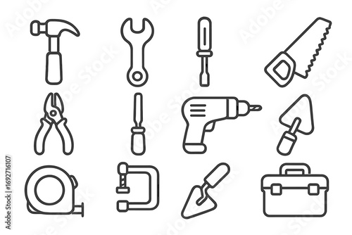 Glossy Tool Icons. Line style icons of glossy tools: glossy hammer, glossy wrench, glossy screwdriver, glossy saw; glossy pliers,