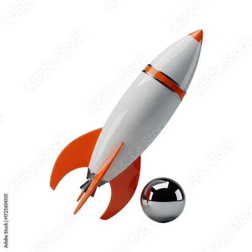 Glossy white retro rocket with orange fins, dynamically angled beside a chrome sphere on a transparent background, high-key lit, no shadows. Concept of minimalist retro design
