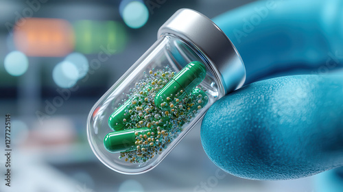 gloved hand holds transparent capsule containing green pills and small beads, symbolizing advanced pharmaceutical technology