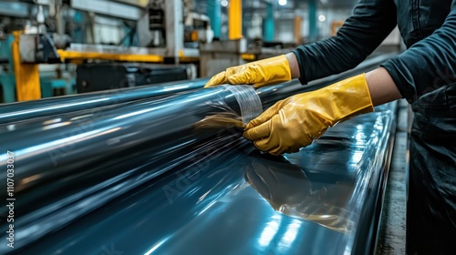 Gloved Hand Working with Large Rolls of Shiny Blue Material
