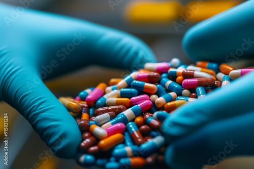 Gloved hands sorting colorful capsules symbolizing precision and control in modern pharmaceuticals captured in a bright clinical setting