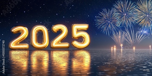 Glowing "2025" numbers in neon over a starry night sky, with fireworks lighting up the background, ideal for a bold wallpaper.