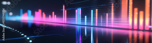 Glowing 3D equalizer bars in a dark environment, 3D background music, vibrant and hightech
