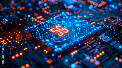 Glowing 5G symbol alongside a quantum circuit pattern on a dark, futuristic background, symbolizing the future of advanced communication technologies