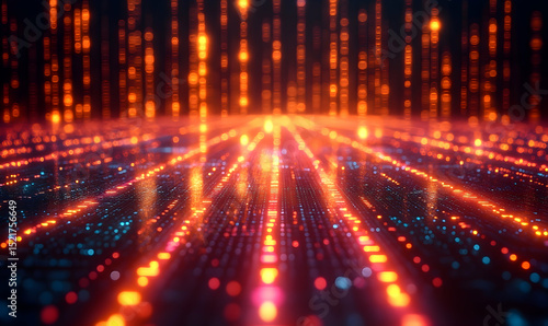 Glowing, abstract digital background with falling lights and grid of bright dots, warm hues with blue accents