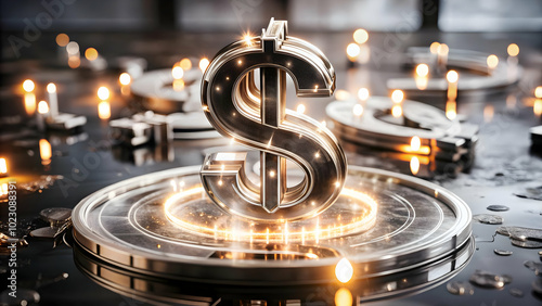 Glowing Abstract Dollar Sign Surrounded by Swirling Marketing Icons - Dynamic Image Symbolizing Financial Success and Innovative Marketing Strategies
