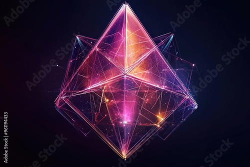 Glowing abstract geometric crystal or diamond shape with colorful light trails